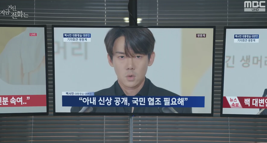 사고 차량이 인양되었으나 희주는 사라졌고, 백사언은 기자회견을 통해 자신의 백의용의 아들도 백장호의 혼자고 아닌 가짜임을 밝힙니다. 또한 자신이 진실되게 밝힐 수 있는 한 가지는 "한 여자의 남편"이라는 것이라며, 자신의 아내 홍희주를 찾아달라고 협조를 요청합니다. 대통령실 전담 수어 통역사 홍희주가 백 대변인의 아내임에 사람들이 충격에 빠진 사이 백사언은 아내가 무사히 돌아올 수 있도록 제발 신고해 달라며 간절히 호소합니다.
