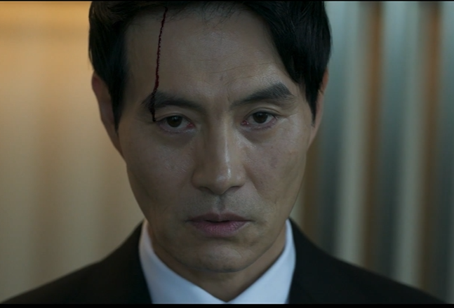 허일도 대표의 방으로 들어오는 순간 염장선은 냅다 명패로 머리를 가격, 피를 봅니다. 알고보니 염장선은 허일도가 학생운동을 하다가 잡혀왔을 때 학생운동 조직도를 작성하라며 잔인하게 고문을 가하셨던 안기부 요원이었군요. 그때의 두려움으로 허일도는 염장선의 인형처럼 움직이고 있나 봅니다. (참 어디에도 안 빠지네요, 그 눔의 안기부 >.<)